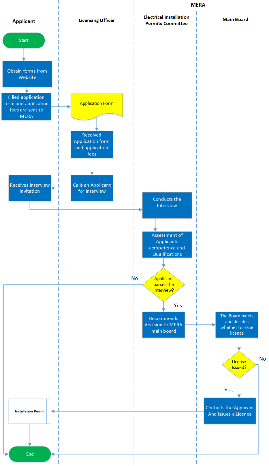 | 6 | The interview is conducted by The Electrical Installation Permits Committee which assesses the competence and qualifications of the Applicants. [There different categories of licences and respective qualifications required under Electricity bylaws of 2012, Part III] | |