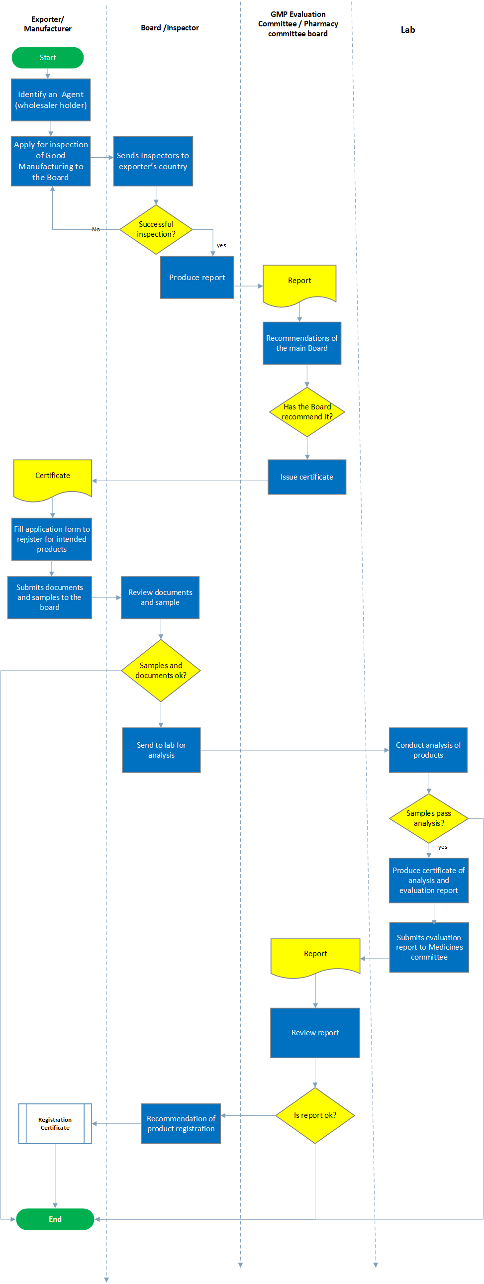 Registration of the Exporter/Manufacturer. (a) Identify an Agent in Malawi who is the wholesaler holder (Pharmaceutical wholeseller). (b) Apply for the inspection of Good Manufaturing practices to the Board in Malawi(GMP). (c) The board sends inspectors to the exporting country(the Applicant) and makes a report on the standard used in manufacturing the medicines. (d) The written report is sent to the GMP Evaluation Committee,and thereafter to the Pharmacy Committee of the Board. (e) Upon noting that all procedures were complied with, the Pharmacy Committee, certifies the report recommends it to the Main Board which certifies the validity of the certificate to export into Malawi to be issued and the duration. (f) The exporter can register the specific medicines he intends to export (This is a must as only registered medinecs can be imported into Malawi). The process of product registration ia as follows