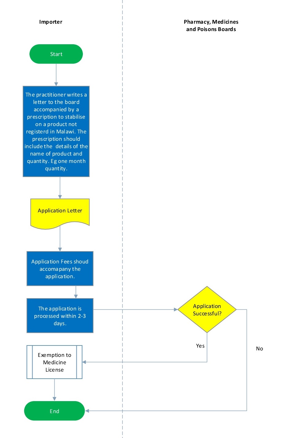 | 1 | The practitioner writes a letter to the board accompanied by a prescription to stabilise on a product not registerd in Malawi. The prescription should include the details of the name of product and quantity. Eg one month quantity. | |